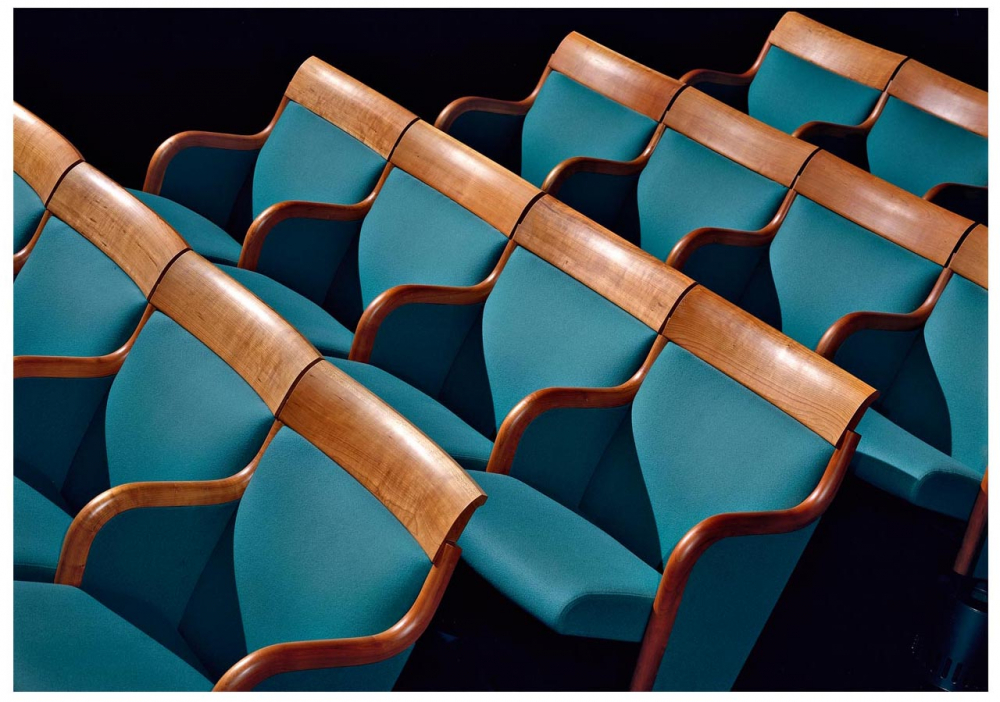 The interior furnishings of the theater were entrusted to Molteni&C and UniFor. In the prototype, the chair was fixed, with a foldable seat, in natural domestic walnut, padded and upholstered in green/sky blue fabric. The seat is was based on the recollection of classical theater seats, but in the designers’ intentions it also looked toward constructive rationalism and to the design traditions of Ligurian and Genoese chairs. In the final version, the seats were produced with glossy black frames and red velvet upholstery.